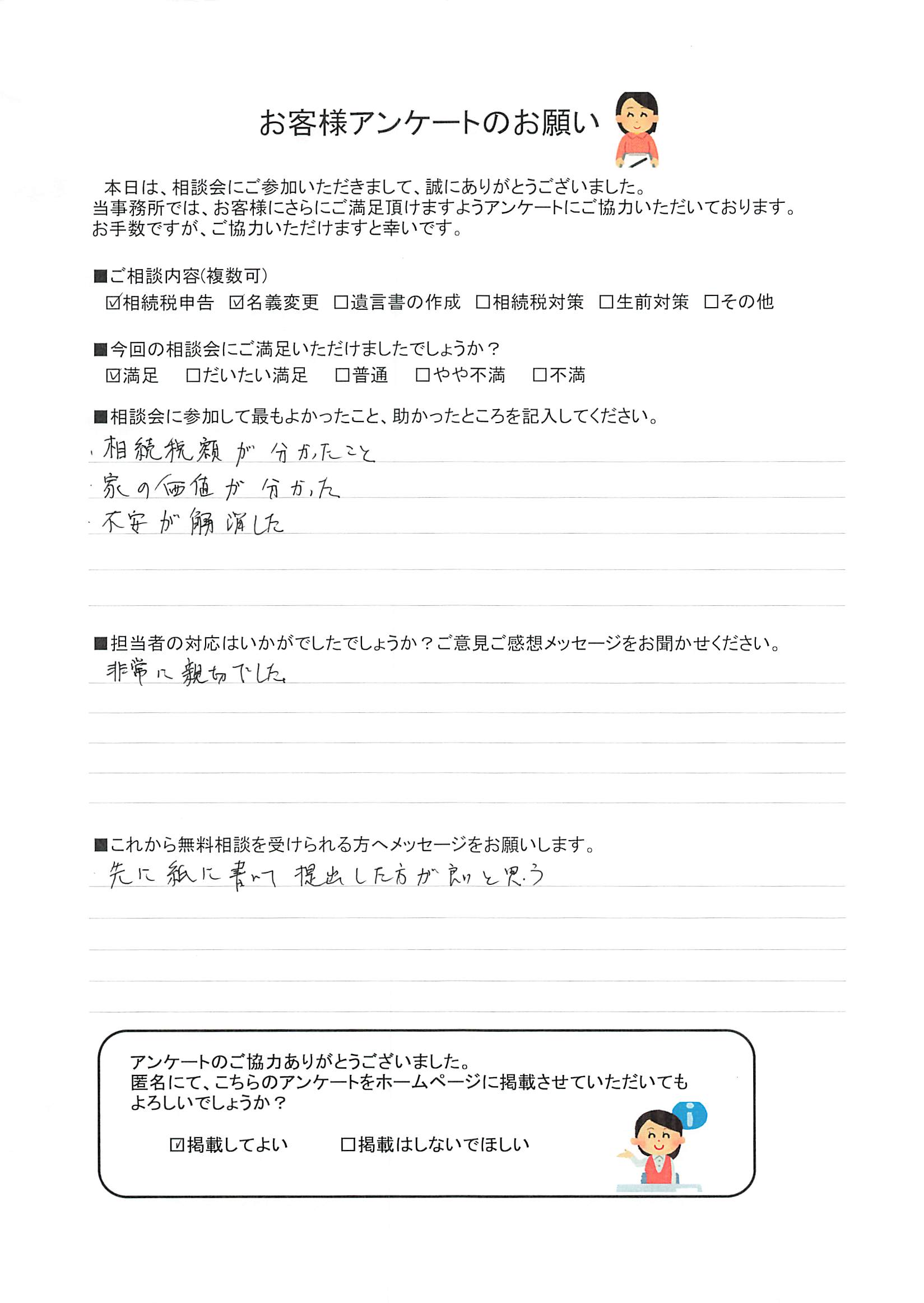 相続に対して知らない事ばかりで、話しを聞いて、いろいろわかりました